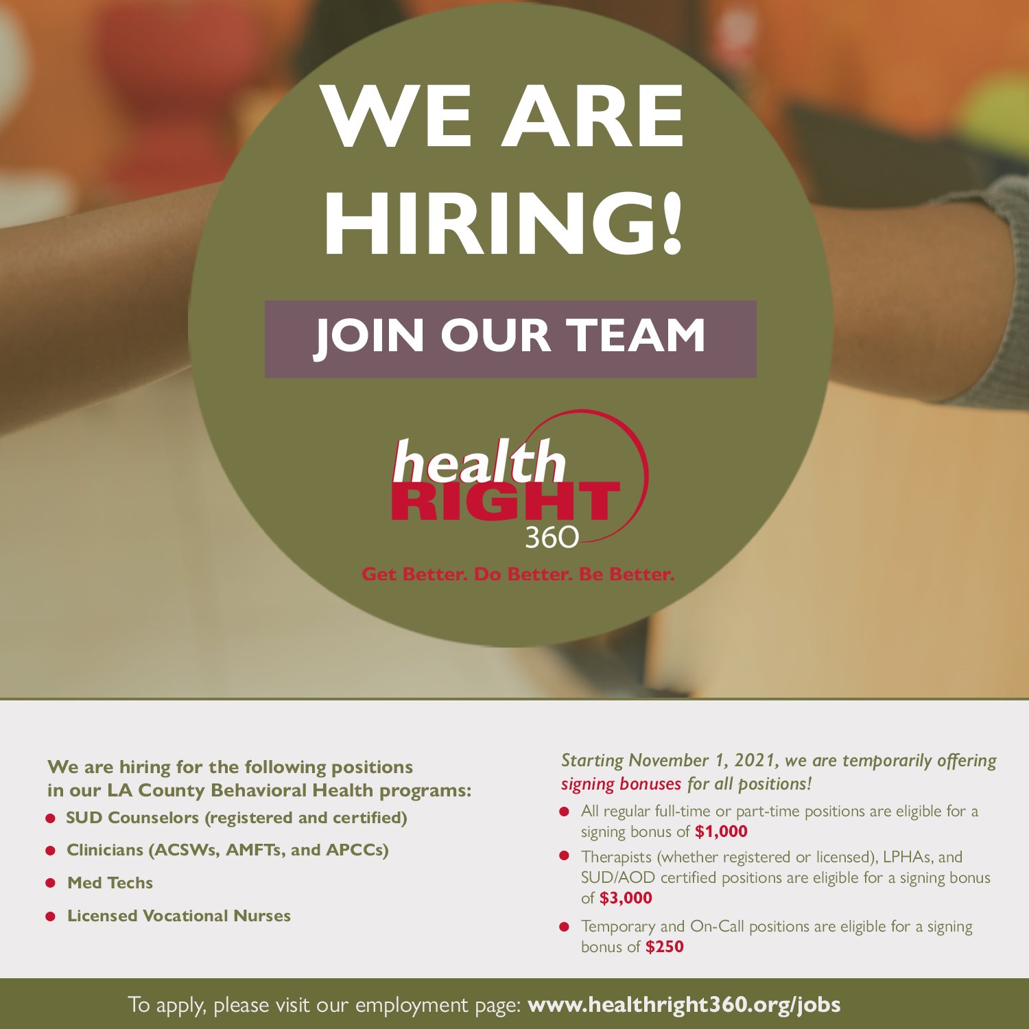 Healthright 360 On Twitter Come Join Our Team We Are Hiring For Multiple Positions In Our La County Behavioral Health Programs And Starting November 1 2021 We Are Temporarily Offering Signing Bonuses